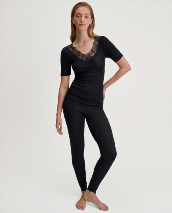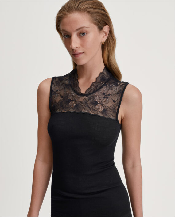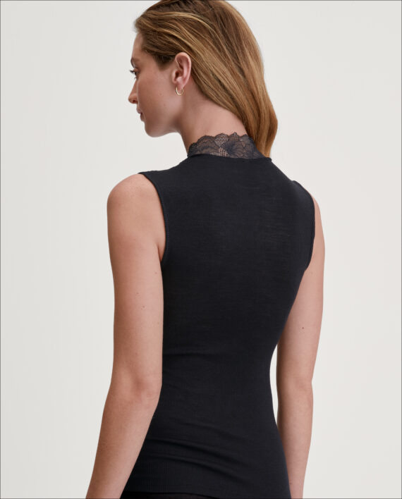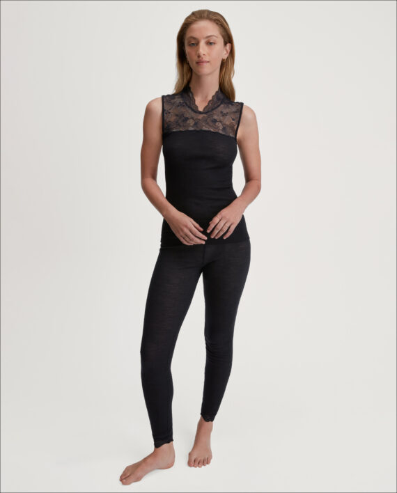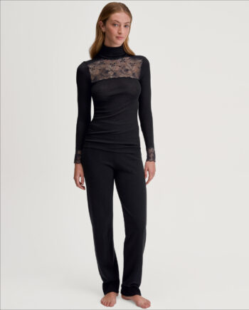Varm, elegant topp for enhver anledning. Laget av varm ull (merino) og silke som puster og regulerer kroppstemperaturen. Fantastisk myk mot huden takket være silken. Dette er en topp som gir en luksuriøs følelse. Delikat blonde detaljer med lurex-tråder som gir et flott skinnende utseende.